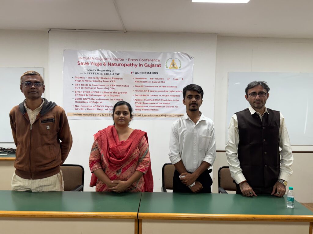 Vadodara – November 2025 : The Indian Naturopathy & Yoga Graduates’ Medical Association (INYGMA), Gujarat Chapter, today raised serious concerns about state policy decisions that have placed the recognised medical system of Yoga & Naturopathy (BNYS) in Gujarat under severe threat.
