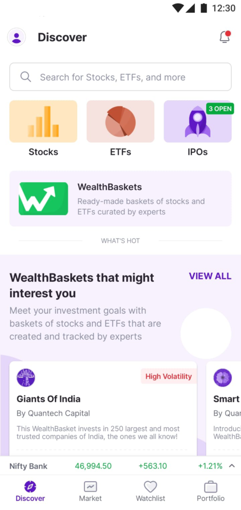 Launched recently, Share.Market elevates discount broking by providing market intelligence, quantitative research-based WealthBaskets, a scalable technology platform, and a great customer experience for investors and traders alike. It provides a wide spectrum of investment products allowing investors across different demographics to build a well-rounded and balanced portfolio. Share.Market offers stocks (intraday and delivery), Mutual Funds, Exchange-Traded Funds (ETFs), and WealthBaskets. WealthBaskets, powered by our in-house Quantitative research arm, are curated collections of stocks/investment products that align with specific themes, sectors, or market trends enabling active equity portfolio building with great convenience.